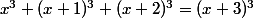 rois cubes sont rempliu d'eau. Le premier est de x le second x+1 et le troisieme x+2 , quand on vide ces trois cubes dans un autre cube de coté x+3 alors ce cube est toujours jsute rempli.