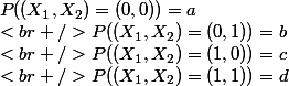 =(0,0))=a\\<br />P((X_1,X_2)=(0,1))=b\\<br />P((X_1,X_2)=(1,0))=c\\<br />P((X_1,X_2)=(1,1))=d)