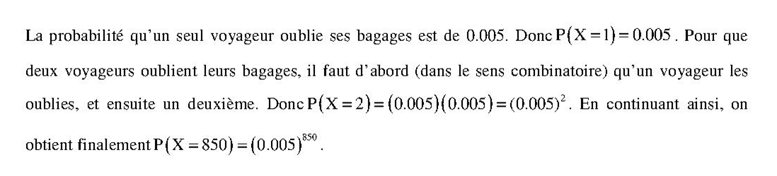 «On admet que la probabilité quun voyageur oublie ses bagages dans le train est de 0.005. Un train transporte 850 voyageurs. On admettra que ces voyageurs se sont regroupés au hasard et que leurs comportements, par rapport à leurs bagages, sont indépendants les uns des autres. On désigne par X la variable aléatoire qui prend pour valeur le nombre de voyageurs ayant oublié leurs bagages dans le train.