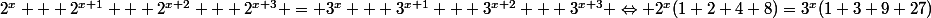 2^x + 2^(x+1) + 2^(x+2) + 2^(x+3) = 3^x + 3^(x+1) + 3^(x+2) + 3^(x+3)