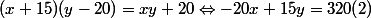 (y-20)=xy+20\ \Leftrightarrow\ -20x+15y=320\ (2))