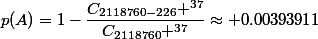 =1-\dfrac{C_{2118760-226} ^{37}}{C_{2118760} ^{37}}\approx 0.00393911)