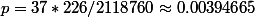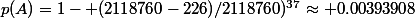 =1- (2118760-226)/2118760)^{37}\approx 0.00393908)
