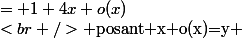 )^4&= 1+4x+o(x)\\<br />\text{ posant x+o(x)=y }& \\<br />(1+x+o(x))^4&= 1+4Y+o(Y)\\<br />(1+x+o(x))^4&= 1+4(x+o(x))+o(x+o(x))\\<br />(1+x+o(x))^4&= 1+4x+4o(x))+o(x)+o(o(x))\\<br />(1+x+o(x))^4&= 1+4x+o(4x))+o(x)+o(x)\\<br />(1+x+o(x))^4&= 1+4x+o(x))\\<br />\end{align})