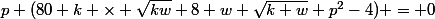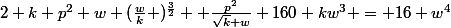 (1) [w+(1/8)*(p^2)*(k^-1/2)*(w^-1/2)+10k]/2p = (1/4)*p*(k^-1/2)*(w^-1/2)
