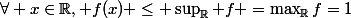\le \sup_{\mathbb{R}} f =\max_{\mathbb{R}}f=1)
