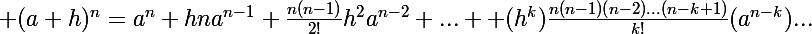 ^n=a^n+hna^{n-1}+\frac{n(n-1)}{2!}h^2a^{n-2}+...+ (h^k)\frac{n(n-1)(n-2)...(n-k+1)}{k!}(a^{n-k})...)
