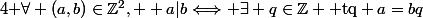 \in\mathbb{Z}^2, \( a|b\Longleftrightarrow \exists q\in\mathbb{Z} {\rm tq} a=bq\))