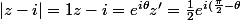\in T( \mathcal{C}(A(i),1)) \Longleftrightarrow z'=T(z)=\dfrac{1}{2}e^{i(\pi/2-\theta)})