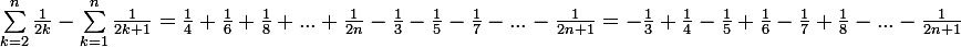 Pour Mehdi : (somme des inverses des pairs) moins (somme des inverses des impairs) = somme alternée des inverses de ces entiers.